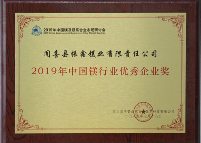 2019年中國鎂行業(yè)優(yōu)秀企業(yè)獎