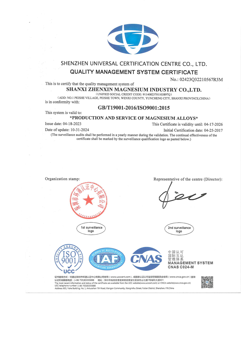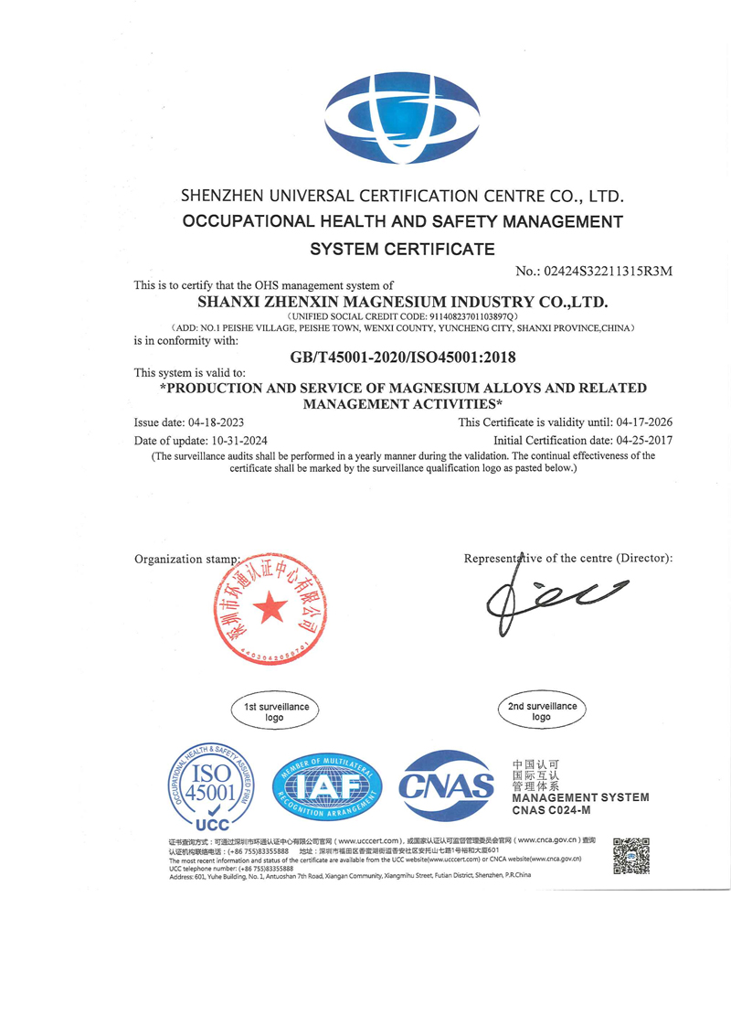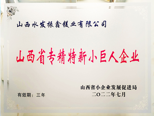 2020年,公司被認(rèn)定為“高新技術(shù)企業(yè)”和“省級企業(yè)技術(shù)中心”,擁有多項專利。先后通過了ISO9001質(zhì)量管理體系、ISO45001職業(yè)健康安全管理體系、ISO14001環(huán)境管理體系和IATF16949汽車行業(yè)生產(chǎn)件與相關(guān)服務(wù)件標(biāo)準(zhǔn)、兩化融合管理體系等認(rèn)證,取得了軍工生產(chǎn)資質(zhì)。是中國有色金屬協(xié)會認(rèn)定為“AAA級信用企業(yè)”,是中國鎂協(xié)會“理事單位”,并獲得山西省“專精特新小巨人”、“節(jié)能減排先進企業(yè)”等榮譽稱號。